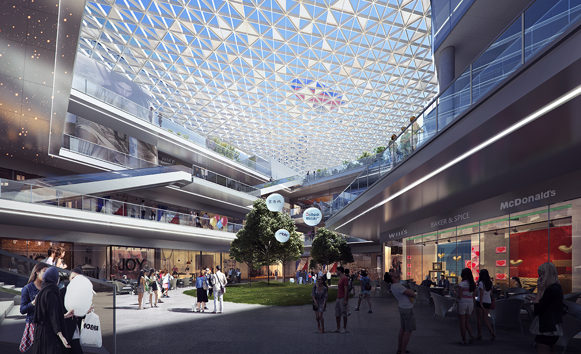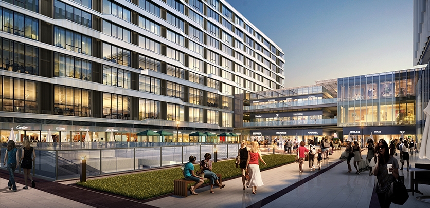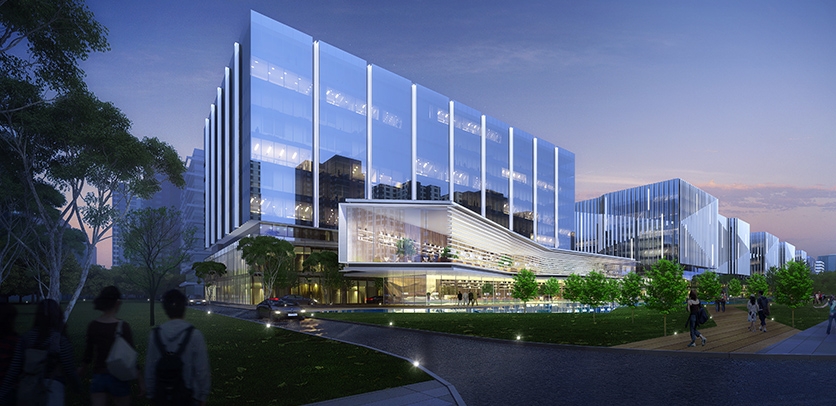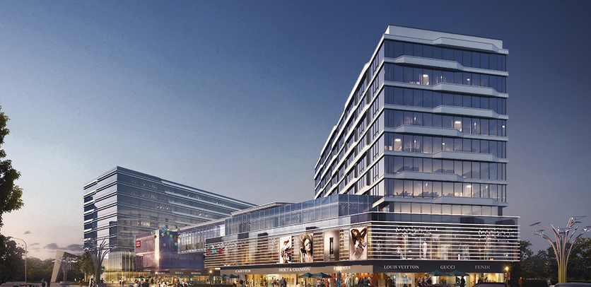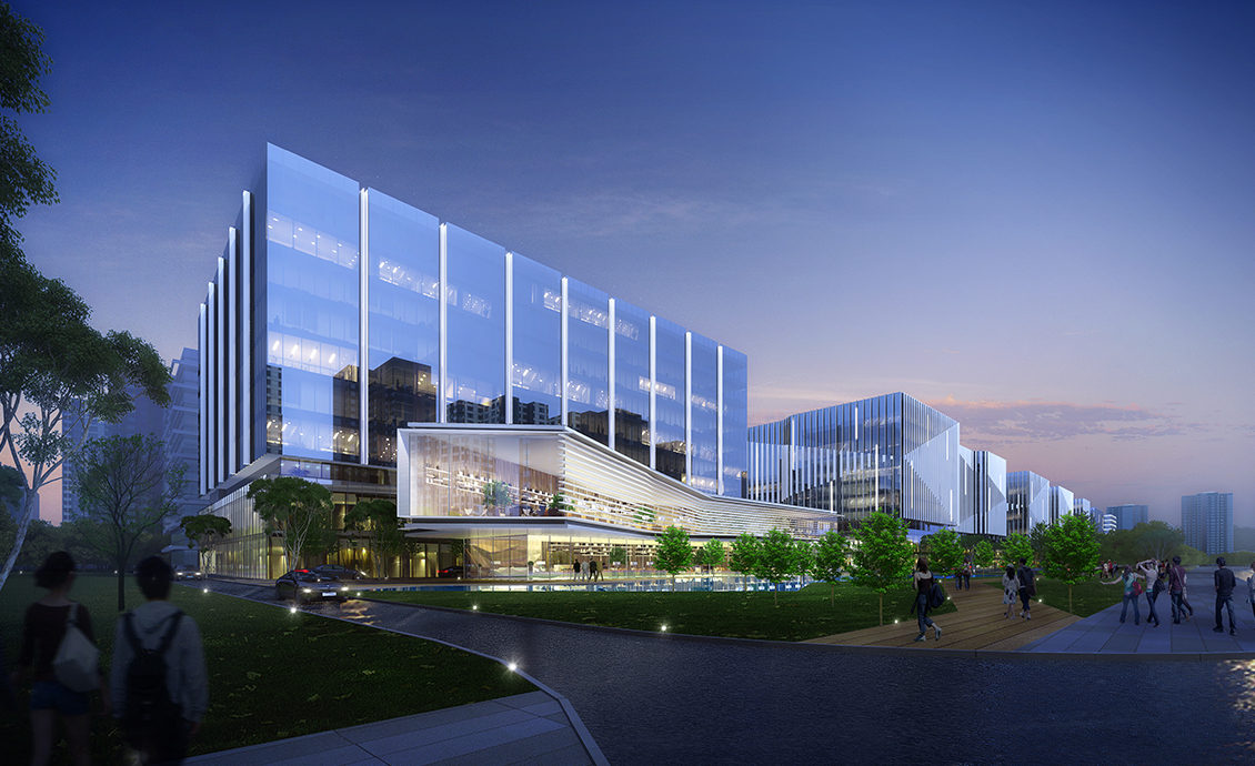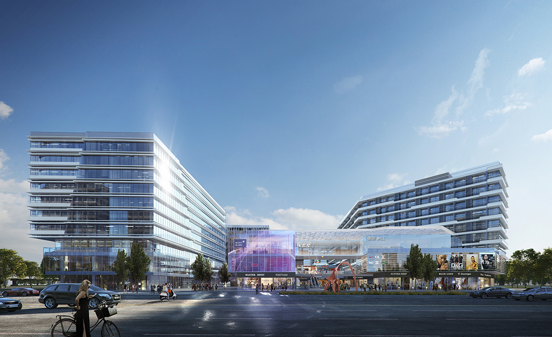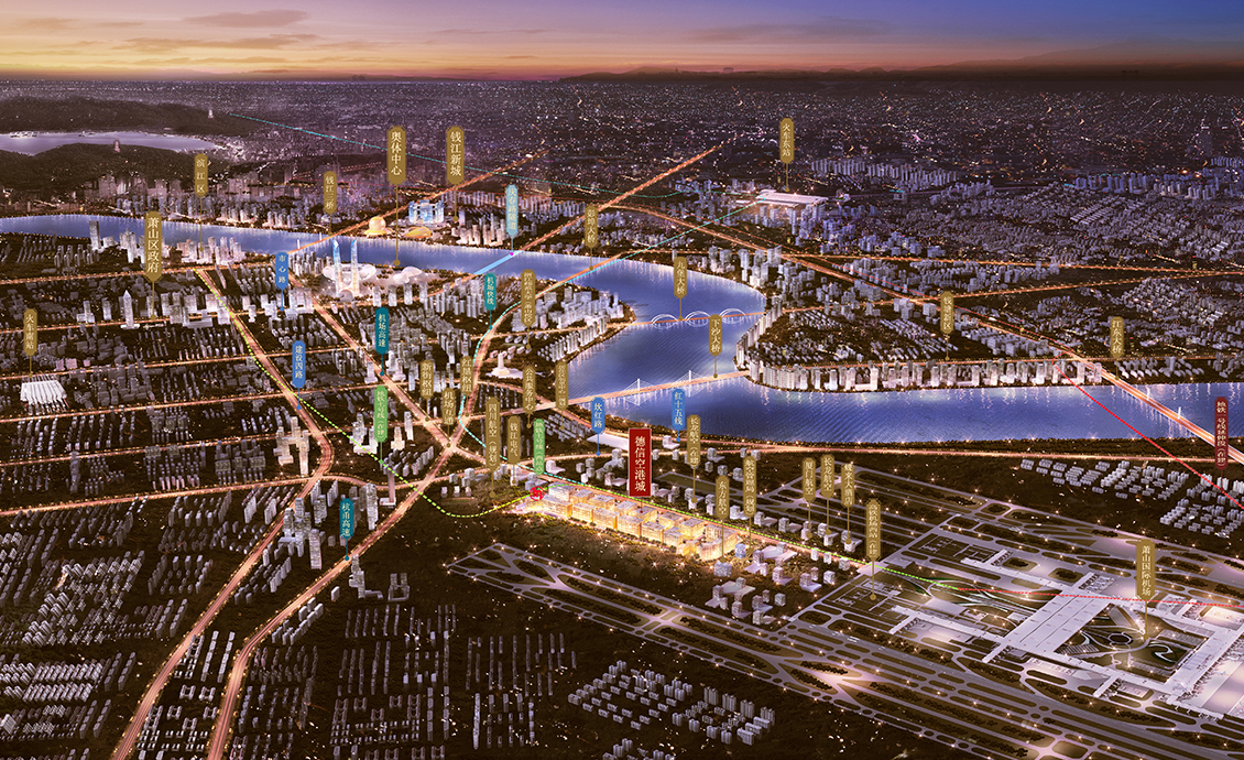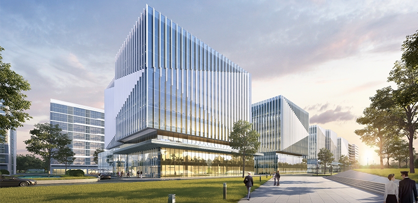 德信空港城总建筑面积约40万方,地铁7号线新港站上盖,一站机场,换乘地铁1号线、机场快线(在建),接轨五维一体国际枢纽(航空、地铁、高铁、高速、快速路)。项目以“未来、生态、高效、复合、智慧”为设计理念,由6幢总部办公、3幢花园独栋商办、8幢国际公馆、1幢高星级酒店、1幢城市会客厅组成,复合工作、生活、休闲、购物等于一体,并引入阿里云智能科技,打造杭州空港首个临空智慧产城。