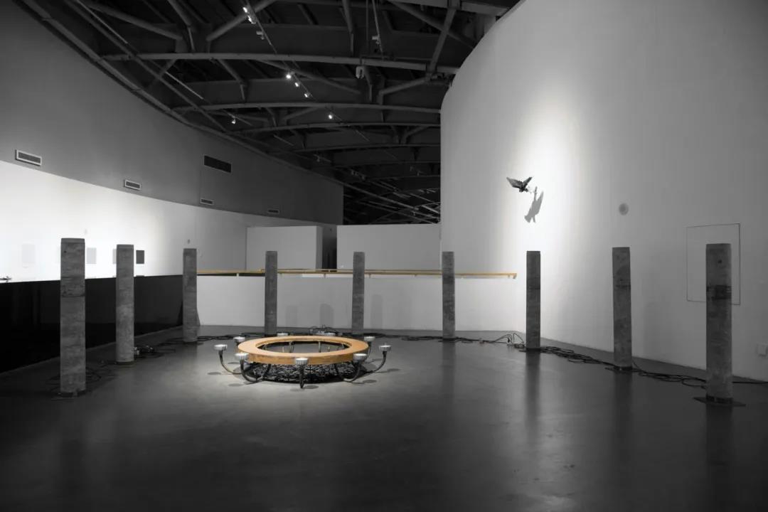 管怀宾 《蚀光》 金属、灯架、黑炭、水泥柱、聚光灯、白蜡、计时器 2016