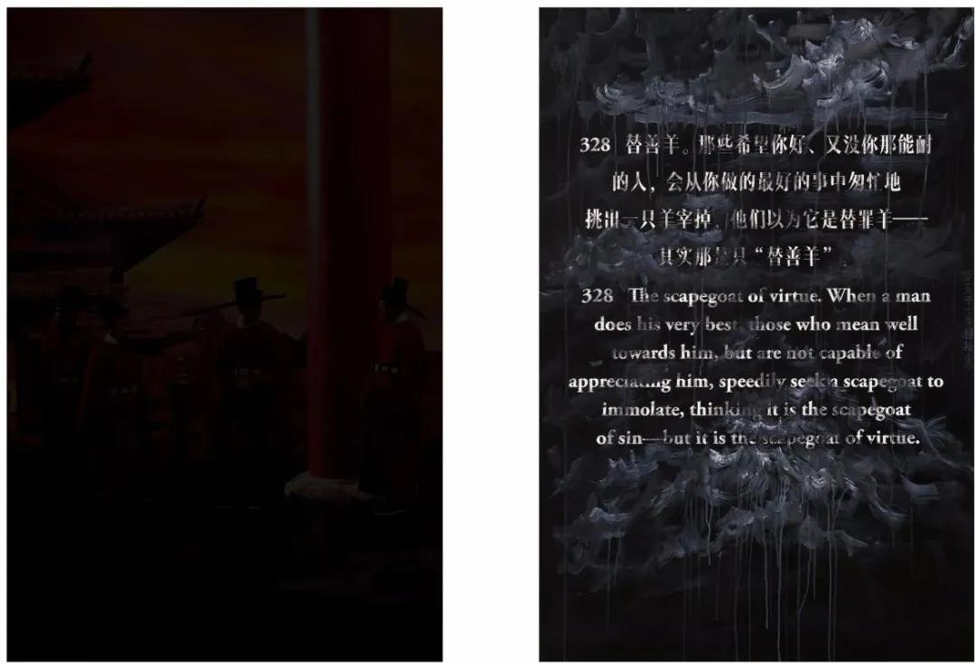 杨福东《善恶的彼岸-真理之敌5》180×120×6cm(×2pieces) 双联;左:彩色喷墨打印,4毫米透光度20%黑色玻璃 右:丙烯绘于黑白喷墨打印照片,4毫米70%透光度玻璃 铝板装裱,不锈钢烤漆黑框 2019