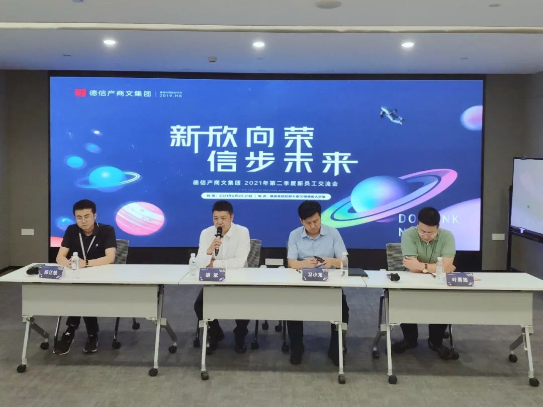 交流会尾声,迎来了重磅环节——高管交流会。德信产商文集团总裁胡斌、德信产商文集团副总裁卫小龙、德信产商文集团副总裁叶勇抱、德信产商文集团人力行政中心总经理陈江钱等高管亲临交流会现场,与新员工们展开了深入交流,并一一解答了大家的疑问。台下新员工们也都聚精会神地聆听高管们的分享。