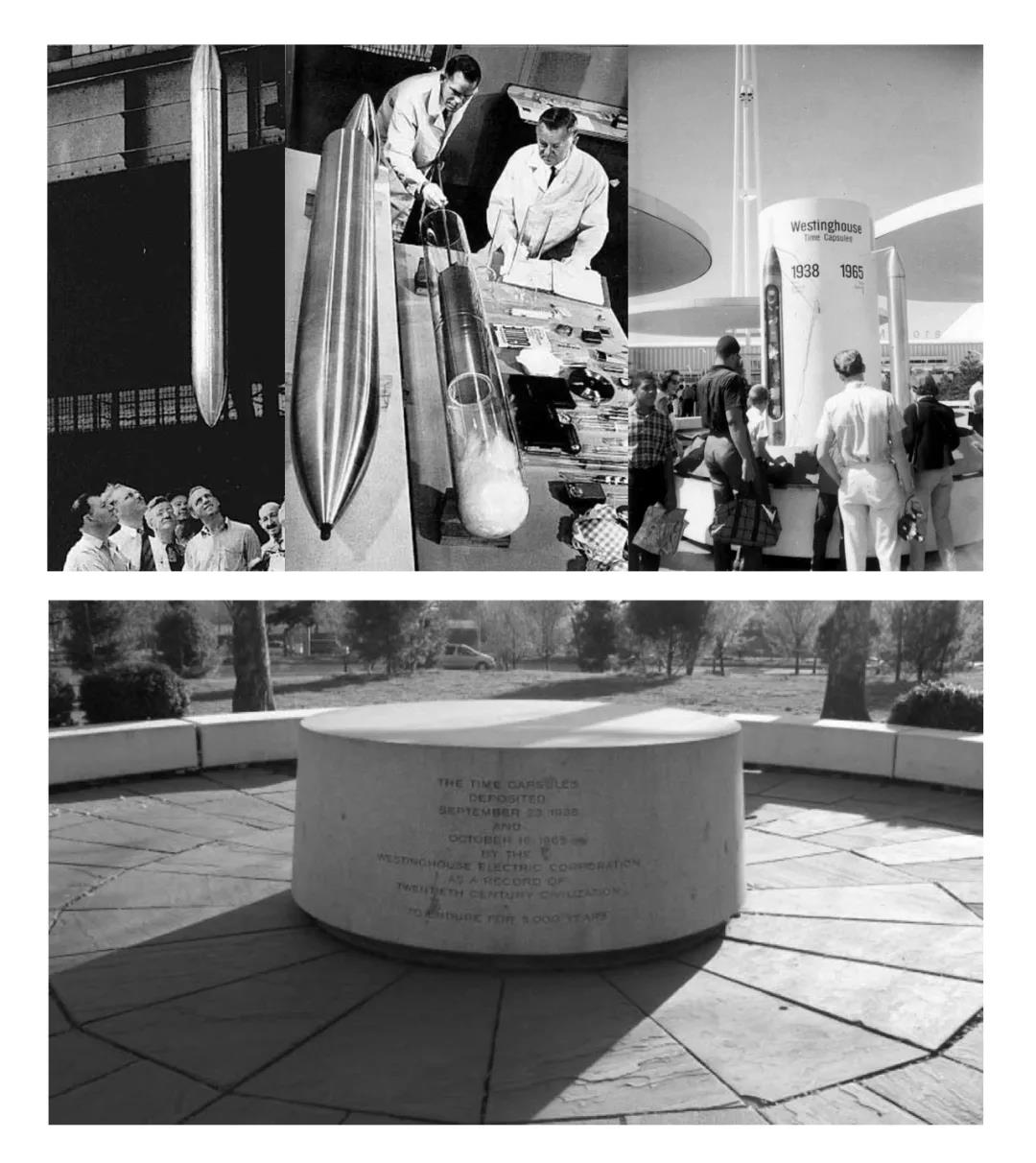 放置时间舱的概念来自于1938年。为了给1939年的纽约世博会一份特别的礼物,美国总统罗斯福邀请爱因斯坦用特制的纸张和墨水,为5000年后的人类写下了《致后人书》。这封信与凝聚着20世纪上半页人类智慧的诸多器物被放置于一个特质容器内埋入地下,等待5000年后人们再挖掘出来研究。