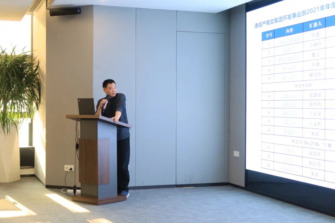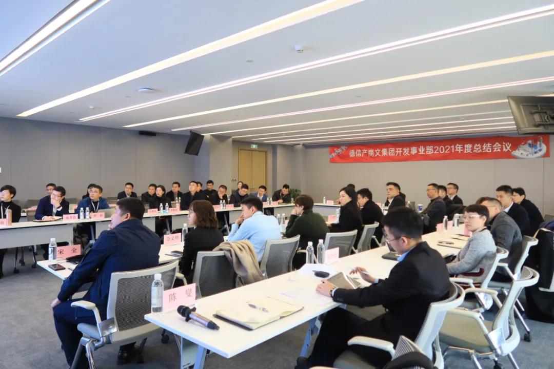 2022年1月12日,德信产商文集团开发事业部2021年年度工作总结会议于德信控股集团总部10楼会议室顺利召开。德信产商文集团总裁胡斌、德信产商文集团副总裁兼开发事业部总经理卫小龙与各项目公司总经理、各职能负责人等40人参加会议。本次会议旨在对2021年年度工作进行梳理和总结,对存在的重难点问题进行讨论,并对2022年年度工作进行规划展望。