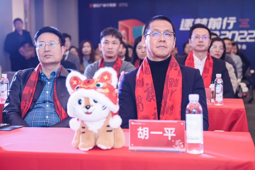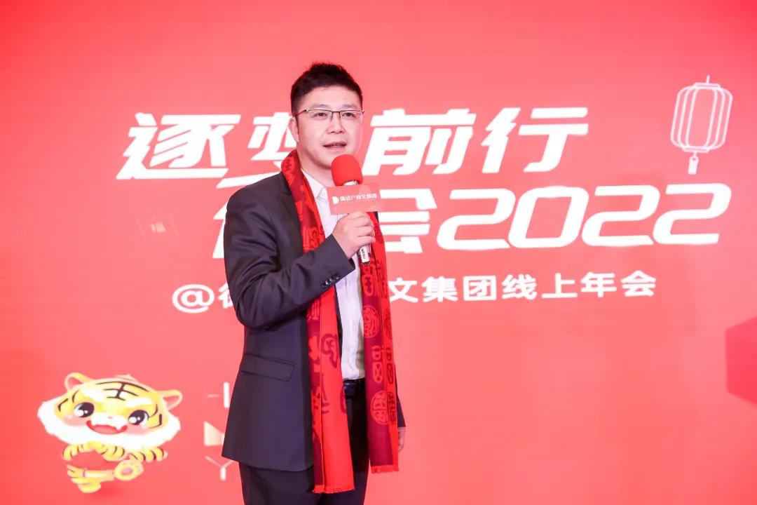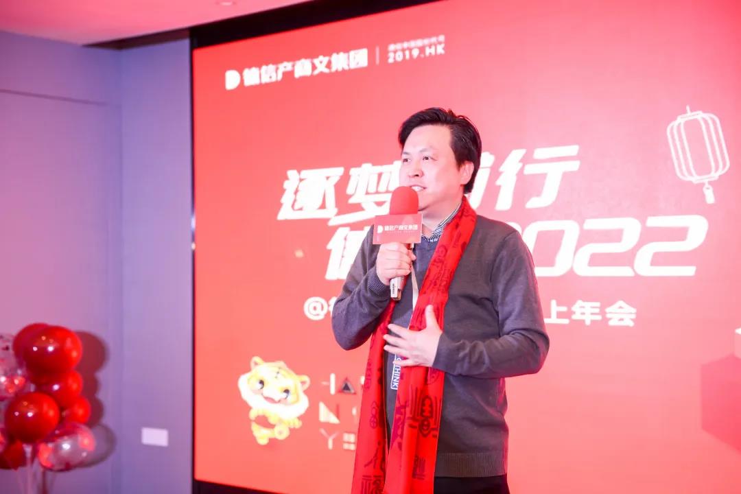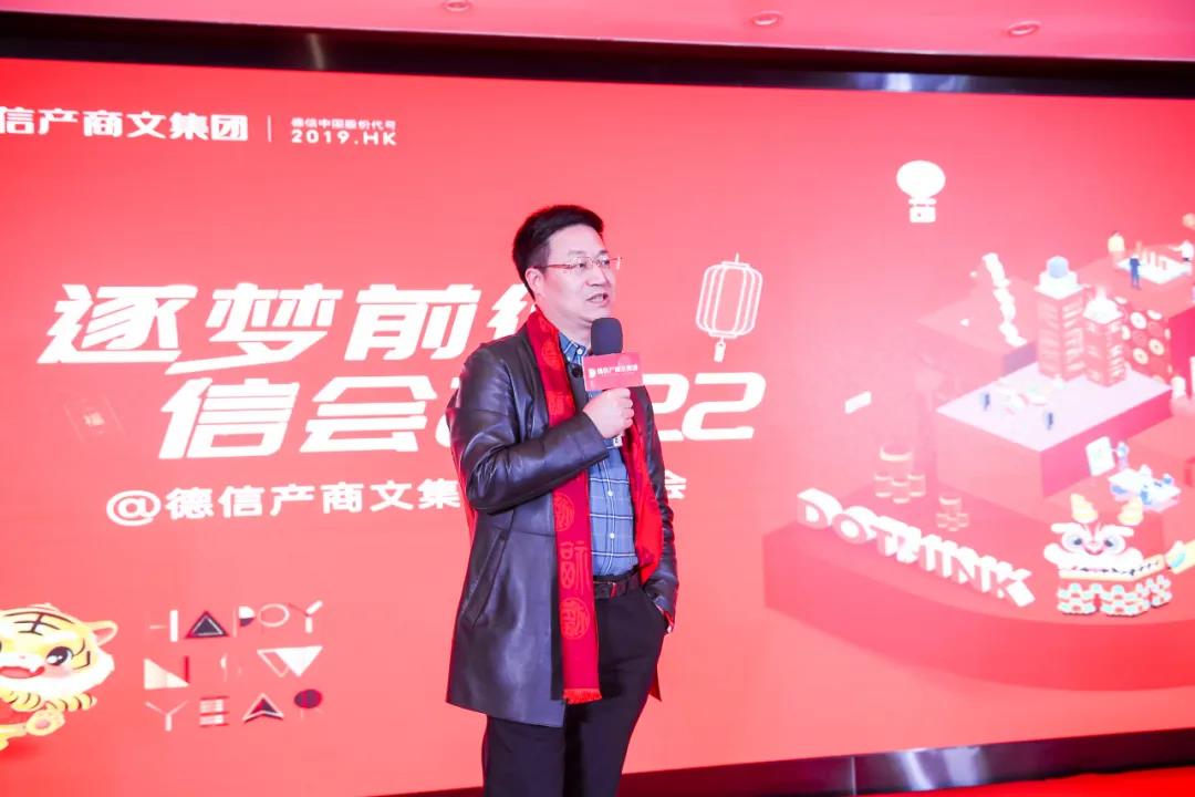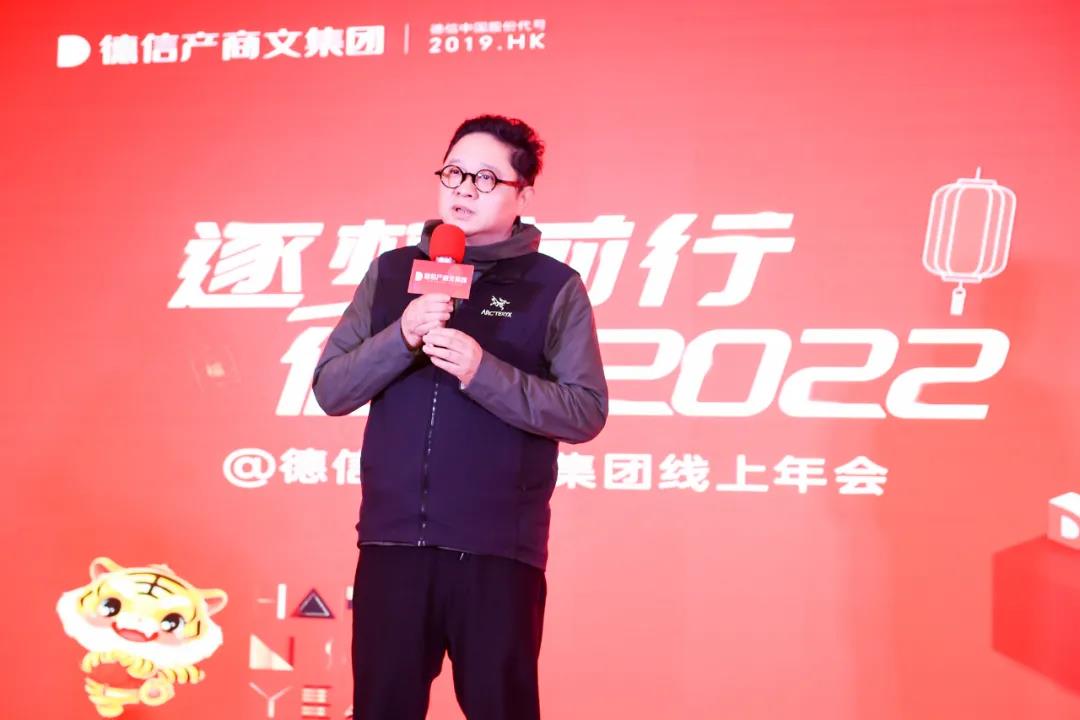 这份喜悦还在延续,德信产商文集团总裁胡斌上台发言,就“热爱”一词展开了深度的解读,胡总表示,在每个小伙伴的热爱与付出下,德信产商文集团展现出了新的生机和未来,同时对2022有了更高的期待,希望大家能在新的平台和组织下,发挥更大的效益,一起与德信产商文集团走向更远的未来。