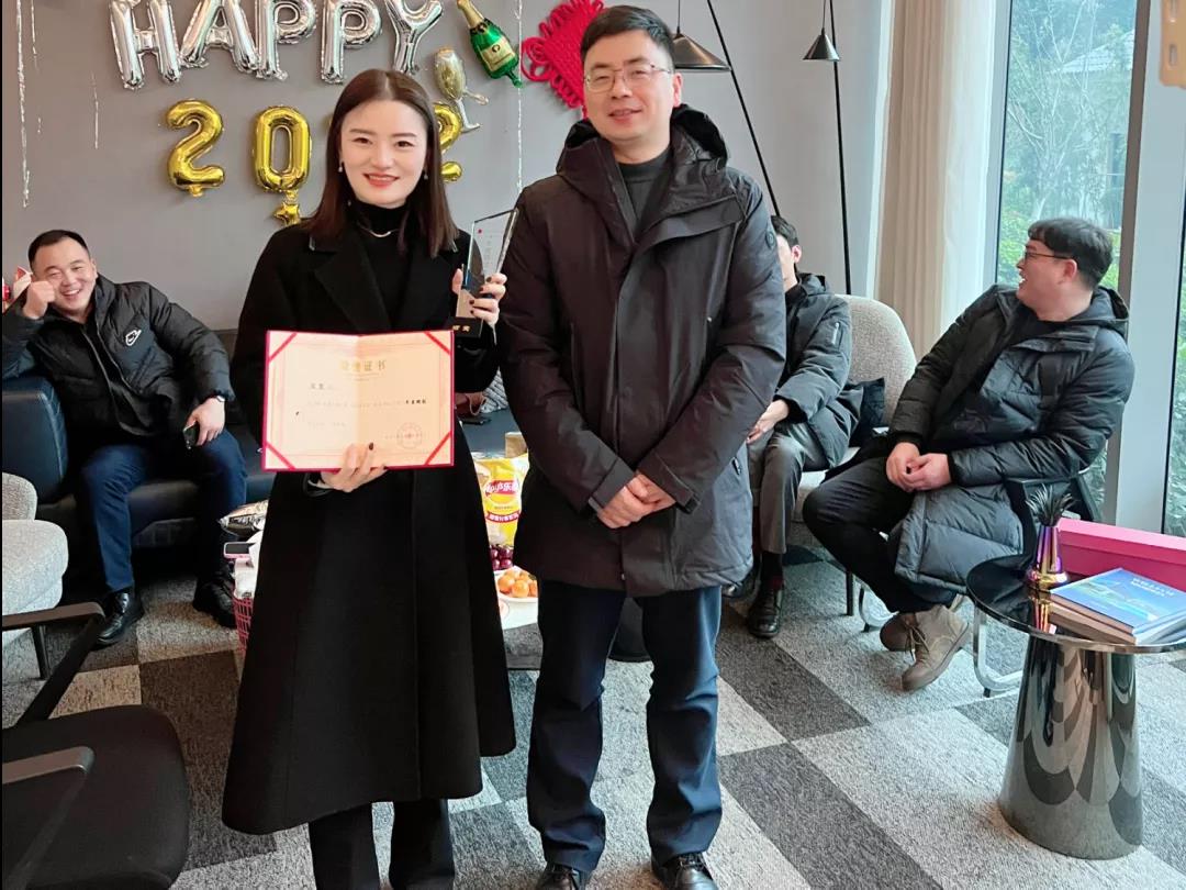 2021年取得的成绩,离不开每一位同仁的拼搏,每一个成就,都凝聚着公司全体员工不懈的努力和付出的辛勤汗水,每位员工都是德信产商文集团最闪亮的那颗星。紧接着在一首《夜空中最亮的星》的歌曲中拉开了2021年度优秀团队、优秀员工评优表彰的序幕。主会场与各分会场联动,同步线下表彰颁奖,在主会场上,胡斌总上台为优秀员工们颁发荣誉证书与奖杯。最后,优秀员工代表在这非常有意义的时刻发表了他们的获奖感言,让大家一起见证了属于他们的荣誉时刻。