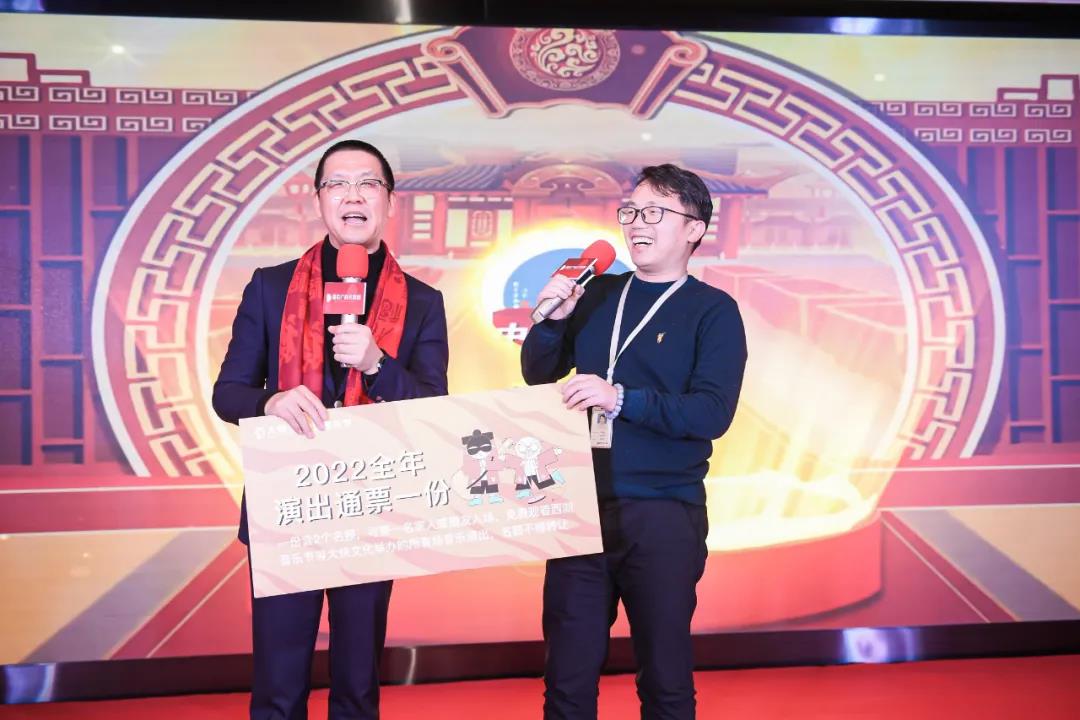 随着本次年会来到了高潮,德信控股集团董事长胡一平上台致辞,肯定了德信产商文集团过去一年的发展和成绩,对过去一年大家的努力与付出,以及各位员工家人的理解和支持表示致谢,更是献唱一首《孤勇者》与大家共同创想未来2022年新的希冀与美好。最后为大家带来压轴惊喜大奖——大快文化提供的西湖音乐节全年演出通票一份,一时之间,引得小伙伴们羡慕不已。