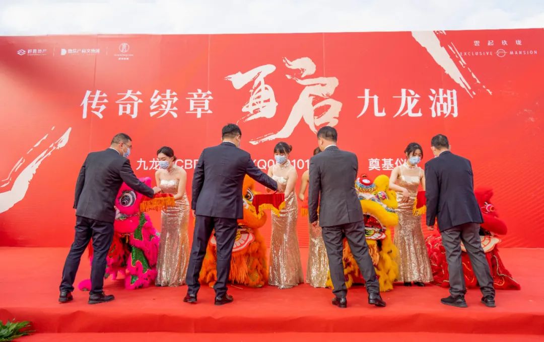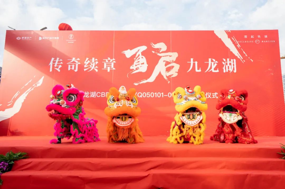 7点55分,祥狮登场,一场热闹非凡的舞狮表演拉开了奠基仪式的序幕,几位领导共同登台,为舞狮点睛并合影,预示着了九龙湖新高阶人居时代的到来。