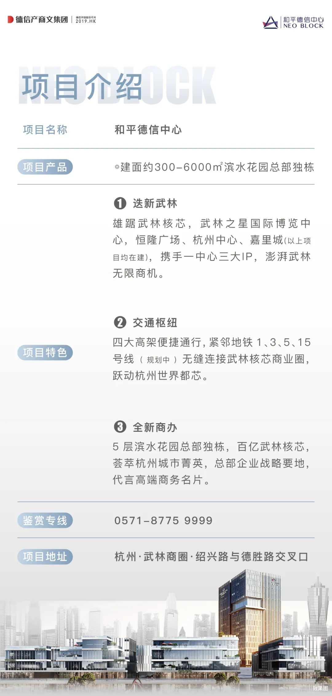 *本项目备案名为“和平德信中心”,本宣传资料为要约邀请,部分图片素材来源于网络,相关内容不排除因政府相关规划、规定及开发商未能控制的原因而发生变化,本公司保留对宣传资料修改的权利,敬请留意最新资料;对项目周边环境、交通及其他配套设施的介绍,旨在提供相关信息,不意味着本公司对此作出了承诺,买卖双方的权利义务以合同约定及补充协议为准。预售证号:杭售许字(2022)第000117号。本资料制作时间为2022年3月,有效期1个月。