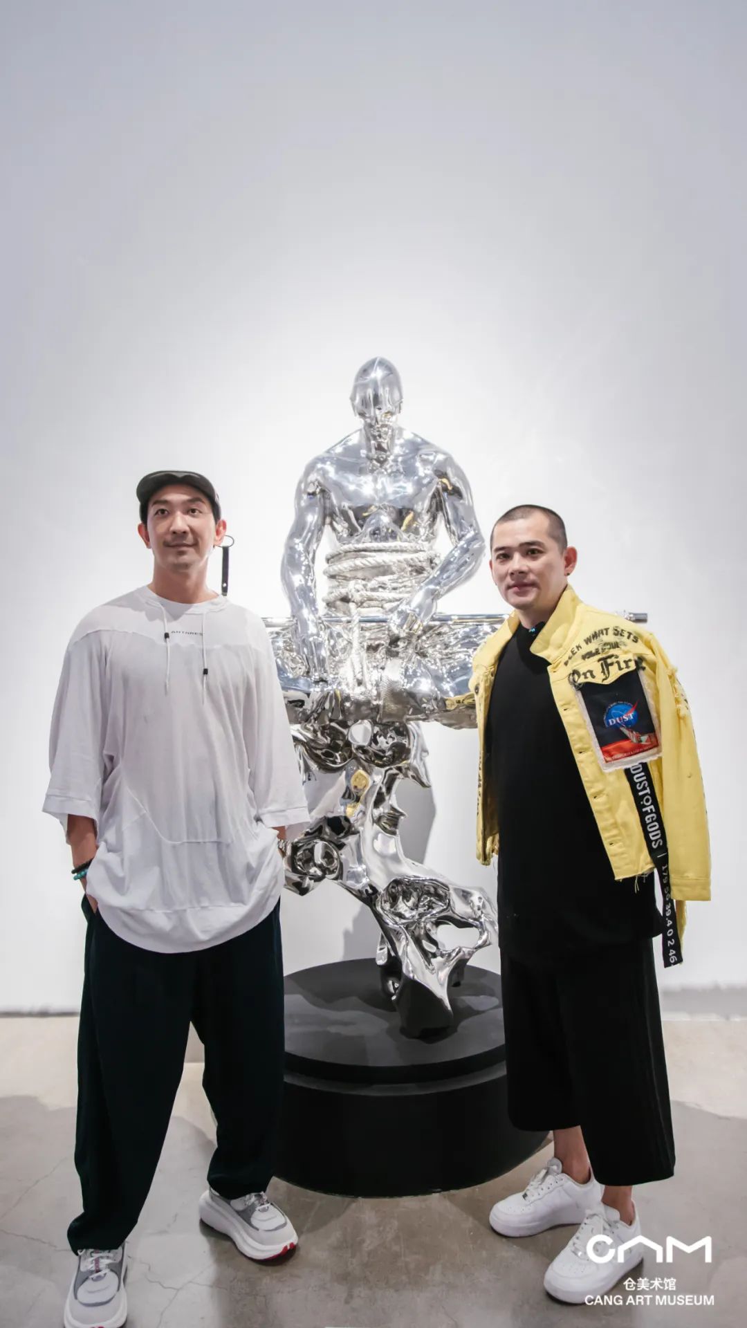 香港演员、歌手、跨界潮流艺术家李灿森先生,也惊喜出现在展览开幕现场,认真欣赏着每一位艺术家的作品,间或同任哲等在场艺术家热络交谈艺术创作并合影留念。